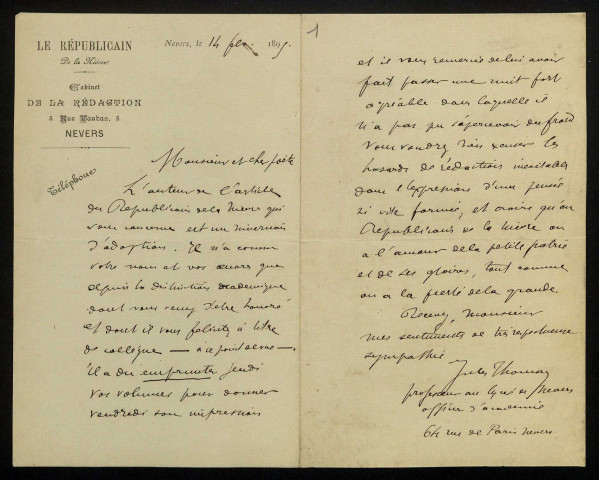 THOMAS (Jules), professeur à Nevers : 1 lettre.