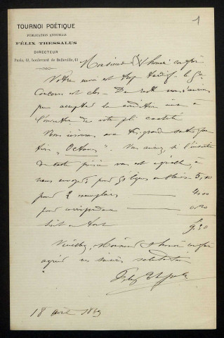 THESSALUS (Félix), directeur du Tournoi poétique : 1 lettre.