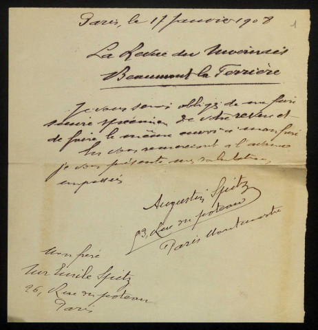 Lettres autographes d'Achille Millien : une carte postale illustrée, une copie de manuscrit (1902-1911).