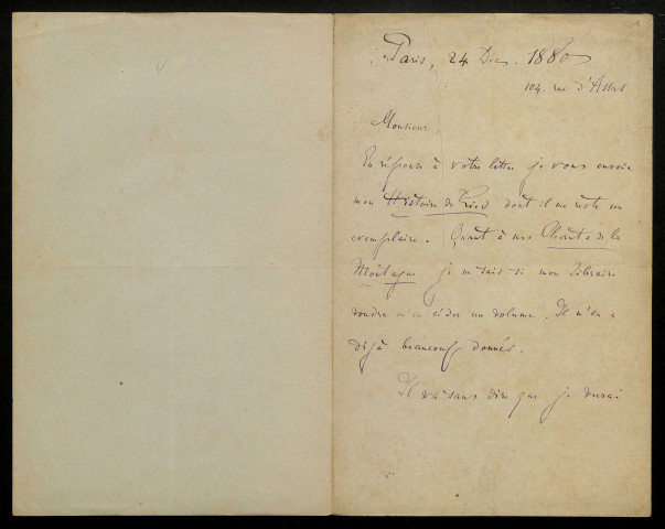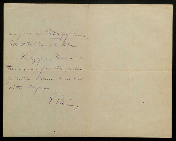 Ms 52 Poésie de Millien mise en musique : revues et extraits de revues, partitions et notes manuscrites, correspondance envoyée par l'abbé Thinot, André Chenal, Albert Arnaud, Fernand Masson, Paul Silva Hérard (1897-1923). Mélodies pastorales par Thalès Bernard (1857-1872). Brouillon d'accords de piano de Jean-Grégoire Pénavaire.