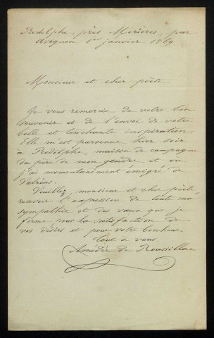 ROUSSILLAC (Amédée de), poète à Morières-lès-Avignon (Vaucluse) : 1 lettre.